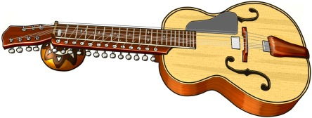 Created as a modified Hawaiian or lapsteel guitar, it has 19 to 21 strings and a gourd added to the neck.
